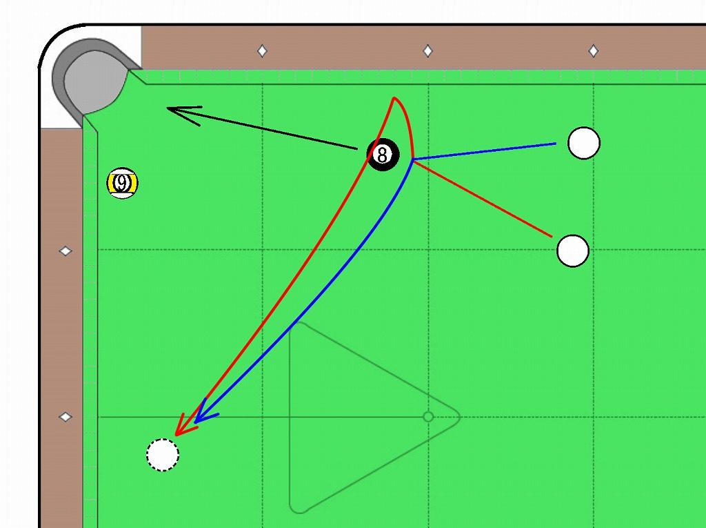 この図のように8番に対して左右どちらかのフリがあれば簡単に9番にポジションできますが、真っ直ぐになったら難しいショットを強いられることになります。