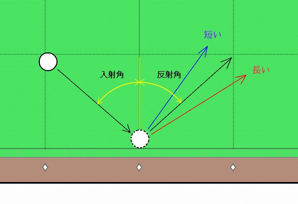 クッションに対して逆ヒネリ(この図では右ヒネリ)をかけたり強く撞いたりすると短くなり、順ヒネリでゆっくり撞くほど長くなります。