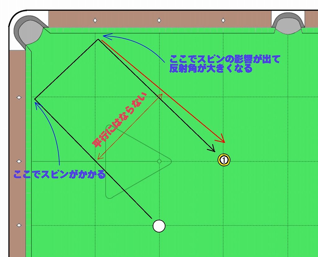 幾何学的には黒線のように狙えば手球は1番に当たるはずなのですが、第1クッション(短クッション)から反射する際に摩擦で手球に少し順ヒネリ(右ヒネリ)がかかってしまい、第2クッション(長クッション)から反射する際にその影響で長くなってしまうのです。