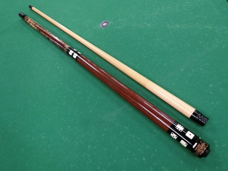 全体の重さは22オンスほどあり、通常のシャフトが重くても120グラムぐらいなのにこのキューのシャフトは150グラム近くあります。シャフトとのバランスを取るためにバット側も重くする必要があり、全体がこんなに重くなっているのです。(それでもかなり前バランスですが)