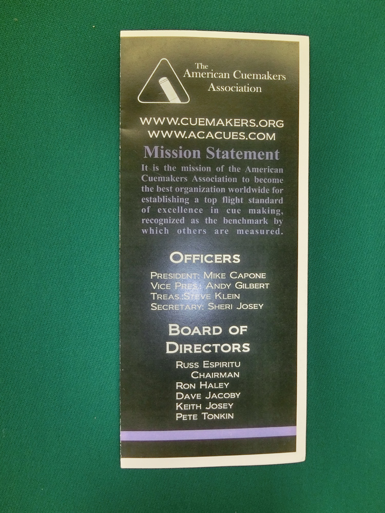 レポートの最後を飾るのは、毎年恒例になっているACA(American Cuemakers Association アメリカキューメーカー協会)のキューコンテストのご紹介です。