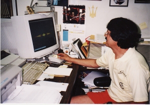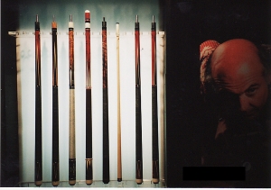 下の写真は、1997年に私が撮った写真です。ジョスウエストキューの製作者であるビル・ストラウドが、コンピューターによるデザインをエキスポでデモンストレーションしているところです。画面には「サルタン」というキューのデザインが映っています。