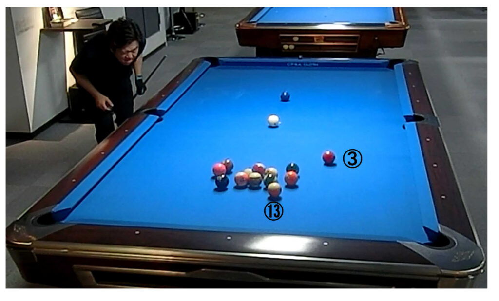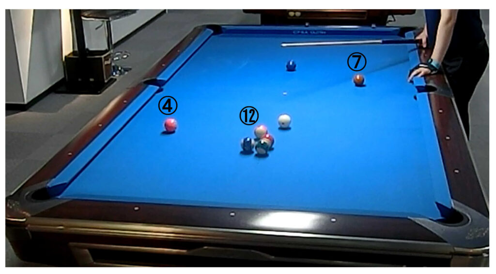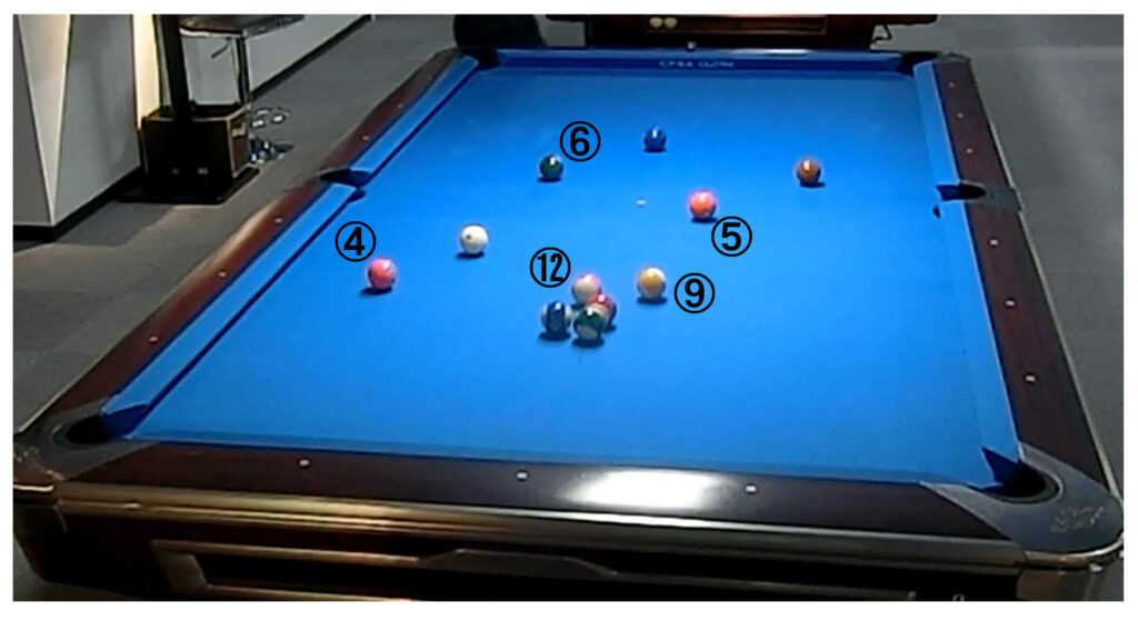 12番から引きをかけて、長クッション間を横切るコースで4番を左フリにするポジションに持ってきたところです。
