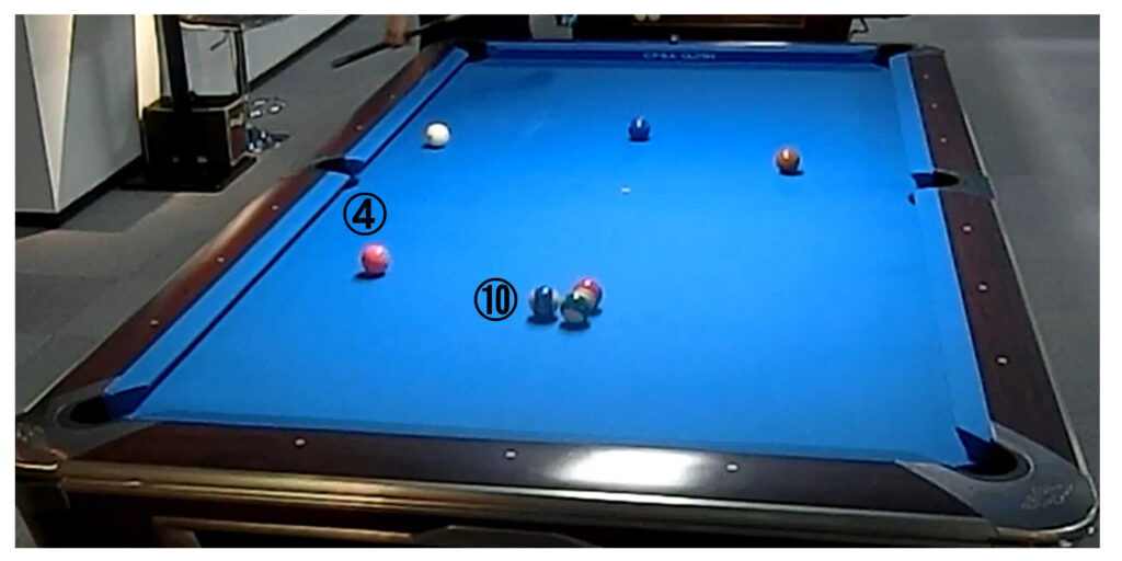 この時点でブレイクボールの有力候補は4番と9番であり、9番はクラスターを割るポジションを取るのに使うことを考えると、4番をブレイクボールに残したいところです。