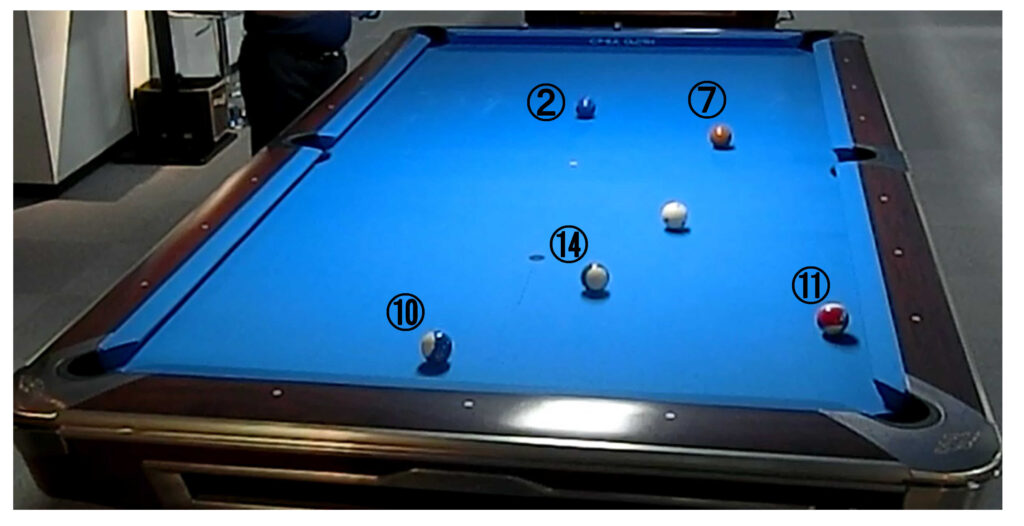 7→2→14→11という順番で入れて10番を右フリにして、ラックの底を叩くブレイクです。10番は中央より少し左寄りにあり、ラックの左側の角を狙ってブレイクして手球をテーブル中央に脱出させられそうな配置です。