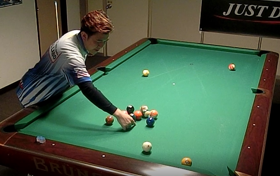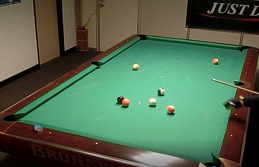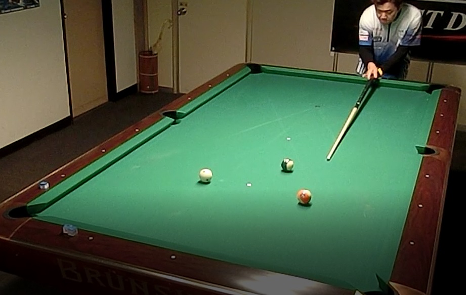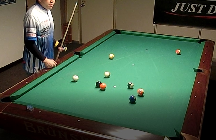 これは意図してそうなったわけではなく、押すと左フット側コーナーへのスクラッチが懸念されるために引きをかけているのですが、手球がラック内の的球に当たる角度がわずかに違うだけで大きく動き方が変わってしまうので、ブレイク後の手球のポジションを正確にコントロールすることが大変難しいのです。