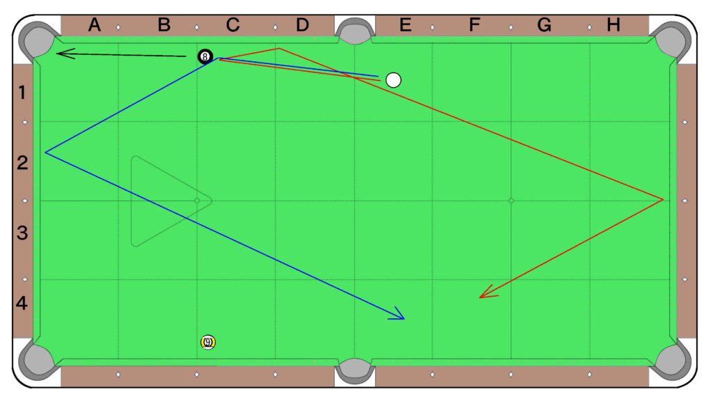 上級者ならこのように引く・押すなどして9番に出して取りきることができますが、どの方法も簡単ではなく手球を強く撞く必要があるために入れポンに比べて8番を入れる確率は下がります。