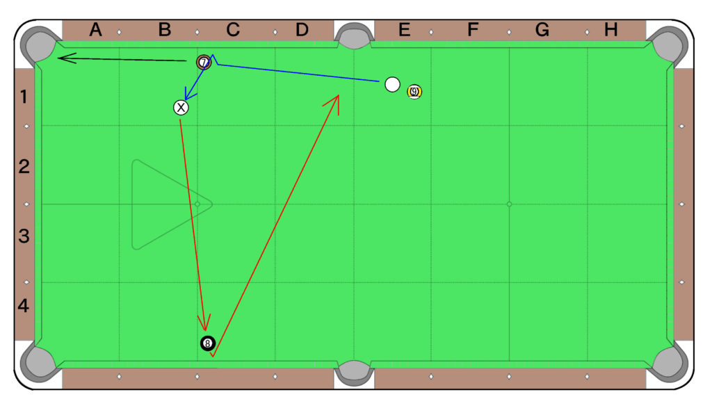 これは先ほどと同じような配置で、7番から8番に出したいのですが、手球に9番が近接しているので球越しの難しいショットになっています。引くことも弾くこともできず、ポジションは押しのコースしかありませんが、キューを立てるため強い押しをかけたら7番をポケットできる確率は大幅にダウンしてしまいます。