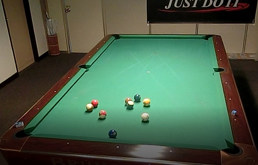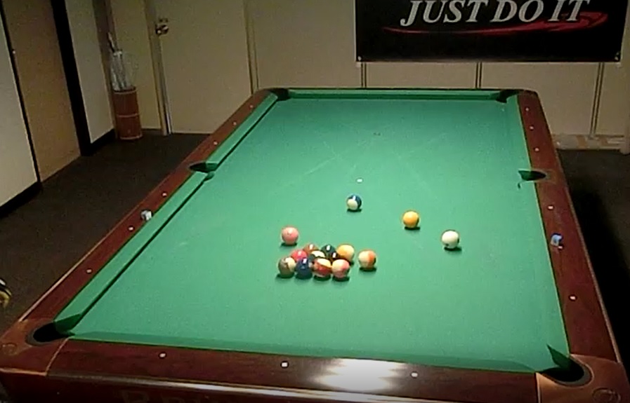 今回はフットレール中央にブレイクボールがあり、ワンクッションでラックを下から割るブレイクです。