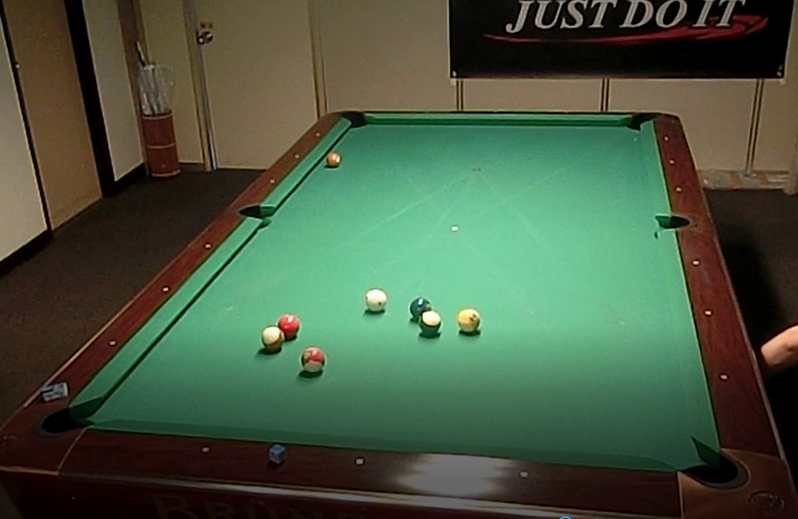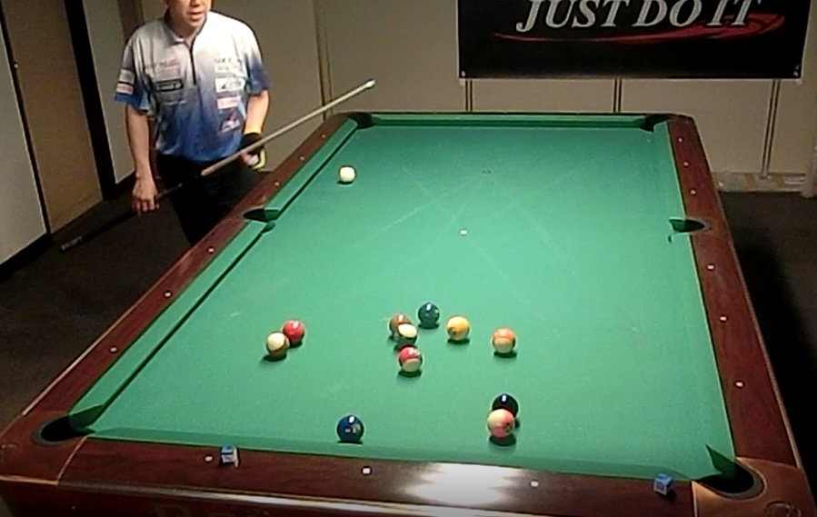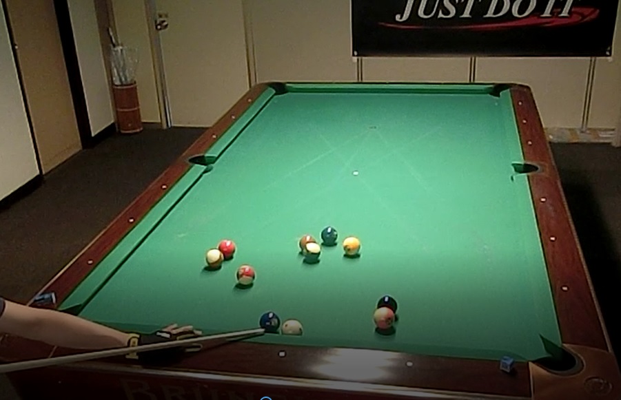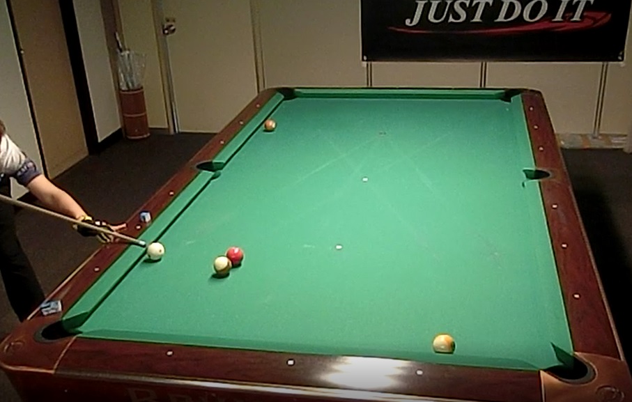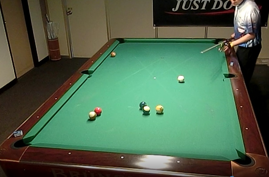 が、羅プロはそうせずに手球を3・15番の左側にポジションして、右コーナーに15番を狙いに行きます。これはもちろん、残った3番がブレイクボールになるからです。