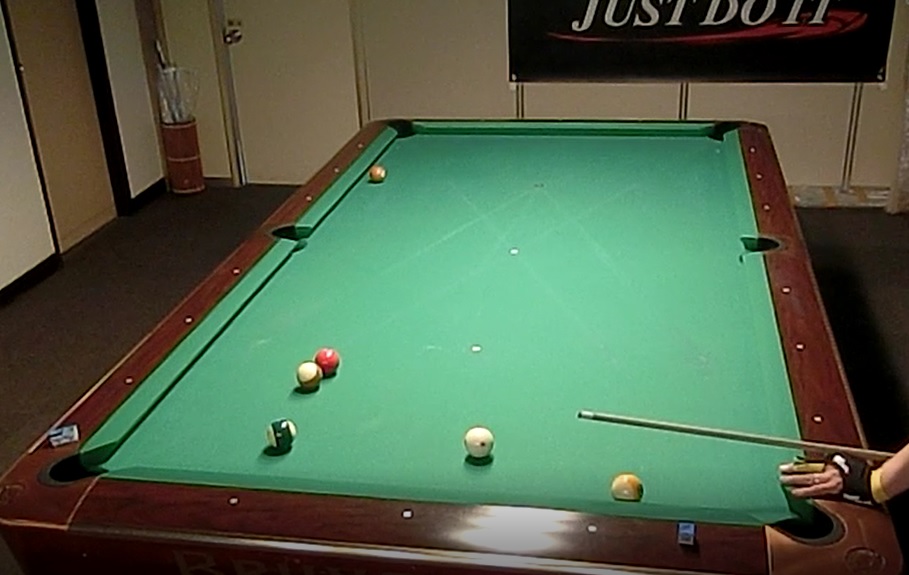 2クッションの場合は手球をブレイクボールに近づけることができますが、良いフリを確保する力加減が結構難しく、少し撞点を誤ればサイドへのスクラッチの危険が出てきます。