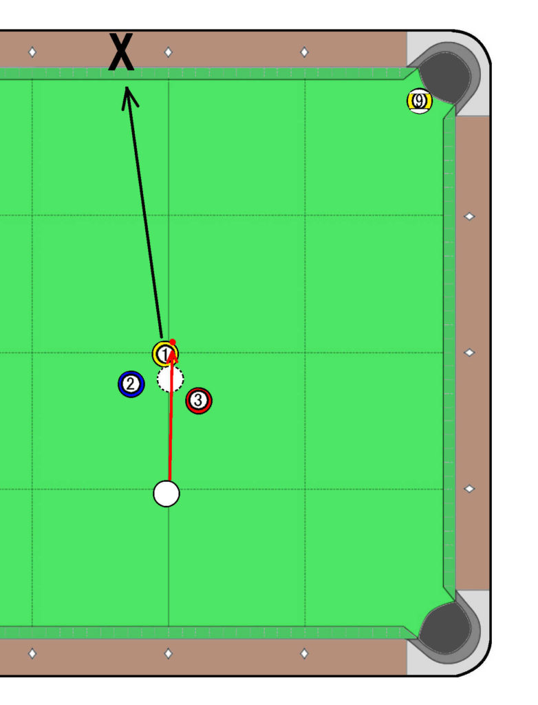 ではまったく方法がないかというと、そんなことはなく、1番の正面近くに手球を当てて「押し抜き」のキャノンショットで9番を狙うことができます。中・上級者の方はご存知の方法ですね。
