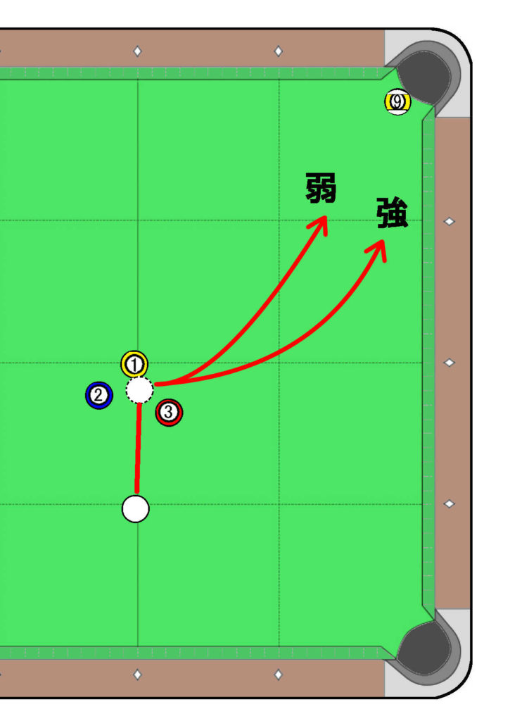 力加減についてですが、押し球の場合はあまり強く撞かず普通の加減で撞いて、手球が弾けないようにしてください。
