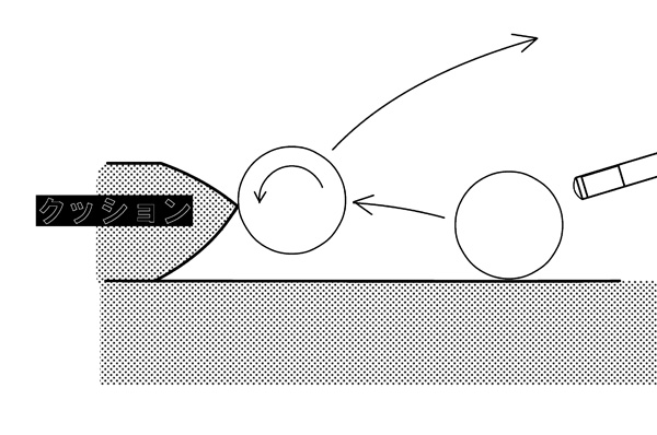 クッションの先端は、手球の中心より少し高い位置に設定してあるので、手球を少しジャンプさせて意図的にクッションから上方向に反射するようにします。