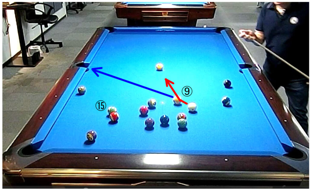 ⑨を入れて手球は⑮を狙う位置に止まりました。