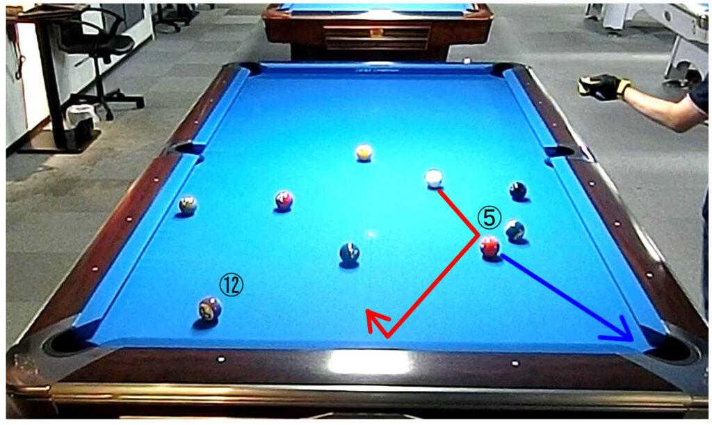 逆ヒネリ(この場合、右ヒネリ)で手球のコース調整が必要なのですが、②③のどこに当たっても次に⑫か⑦が狙えるでしょう。