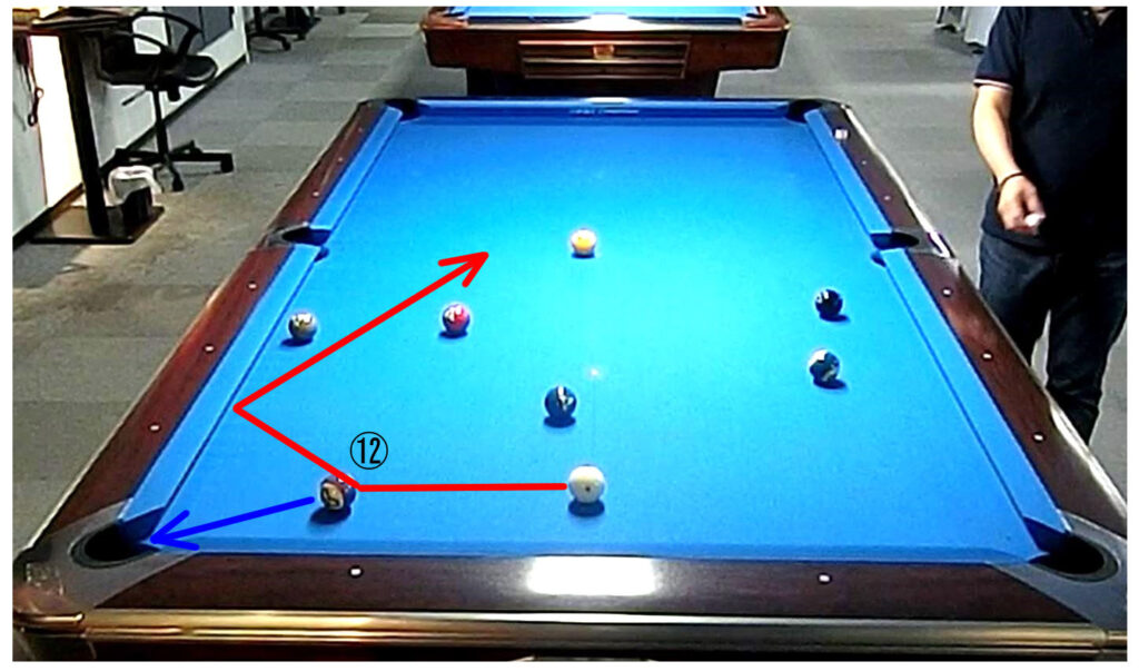 ⑫から先も取り方がいくつか考えられますが、的球の数が少なくなるとポジションに失敗した際にリカバリーが難しくなる可能性が高まるので一層の注意が必要です。