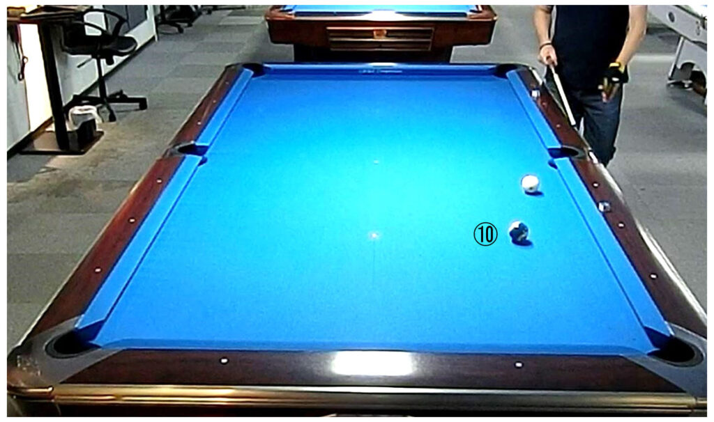 ⑩はラックから遠く離れているので、薄めにポジションして手球がラックに強く当たるようにします。