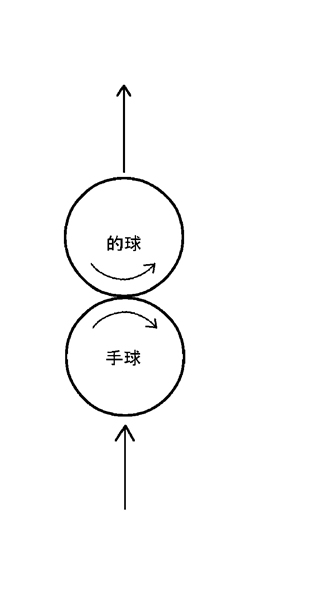 的球を右にずらしたい場合、図のように手球に左ヒネリをかけると、ヒネリの摩擦力が的球を少し右側にずらします。同時に的球に手球とは反対方向のヒネリがかかります。(この図の場合右ヒネリ)