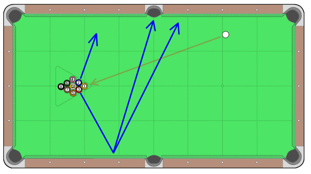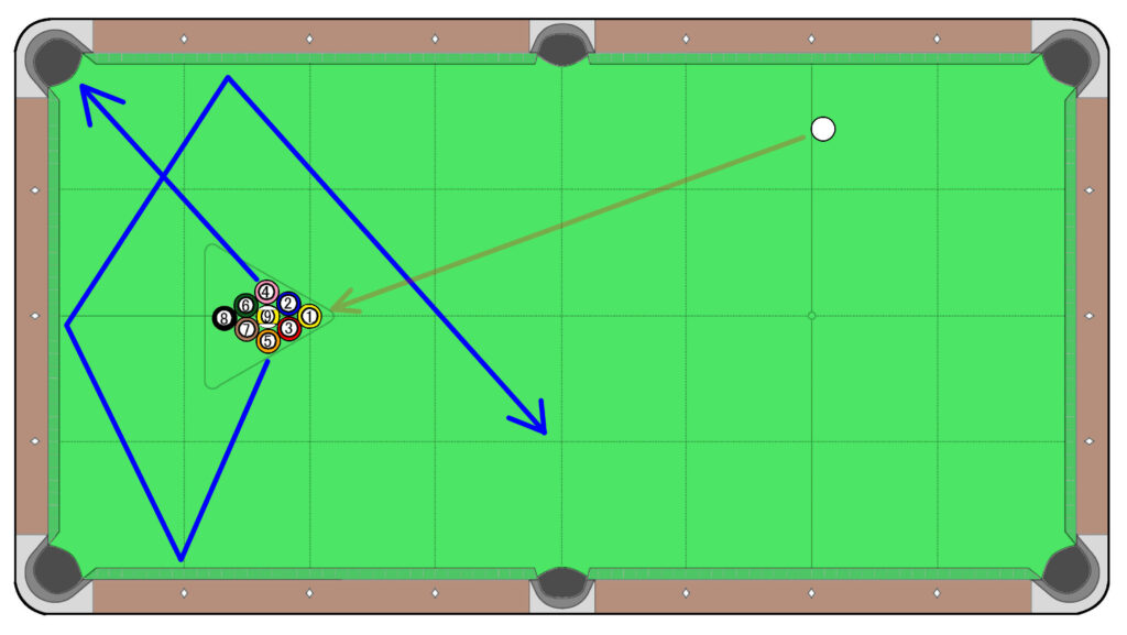 しかしこれも確実に①がポケットする保証はなく、手球のコントロールが格段に難しくなるというデメリットがあります。
