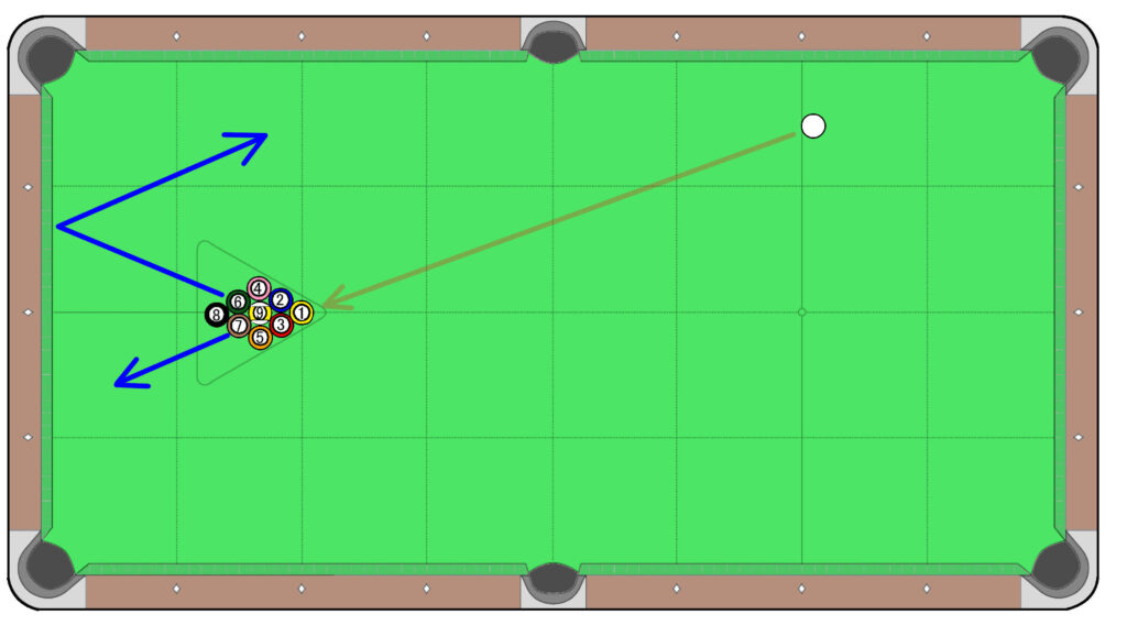 ナインボールではウイングボールが高確率でポケットされるのですが、テンボールではそのような的球がないので①をサイドにポケットするために手球を①の真正面ではなく少しずらして当てる「カットブレイク」という方法があります。