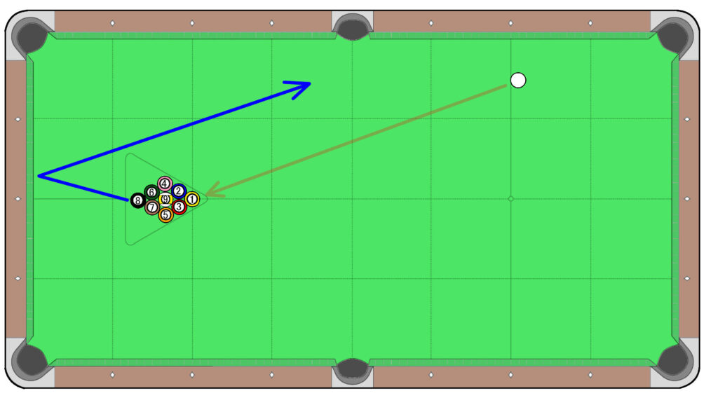 最後尾にある⑧の位置にある的球は、フットレールからやや右側に跳ね返った後、ヘッド側に向かいます。この動きはかなり早いので、ヘッド側のコーナーにポケットする可能性もあります。