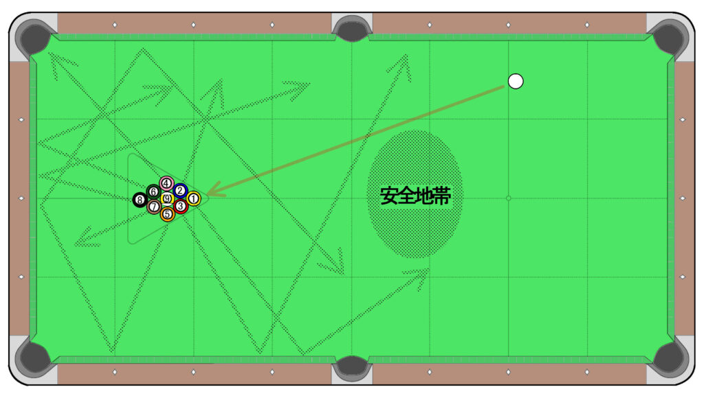 また、手球は安全地帯に留まることを前提にしているので考慮していませんが、現実には強く撞いたうえで手球をこのエリアに留めるのはプロでも至難の業なのです。