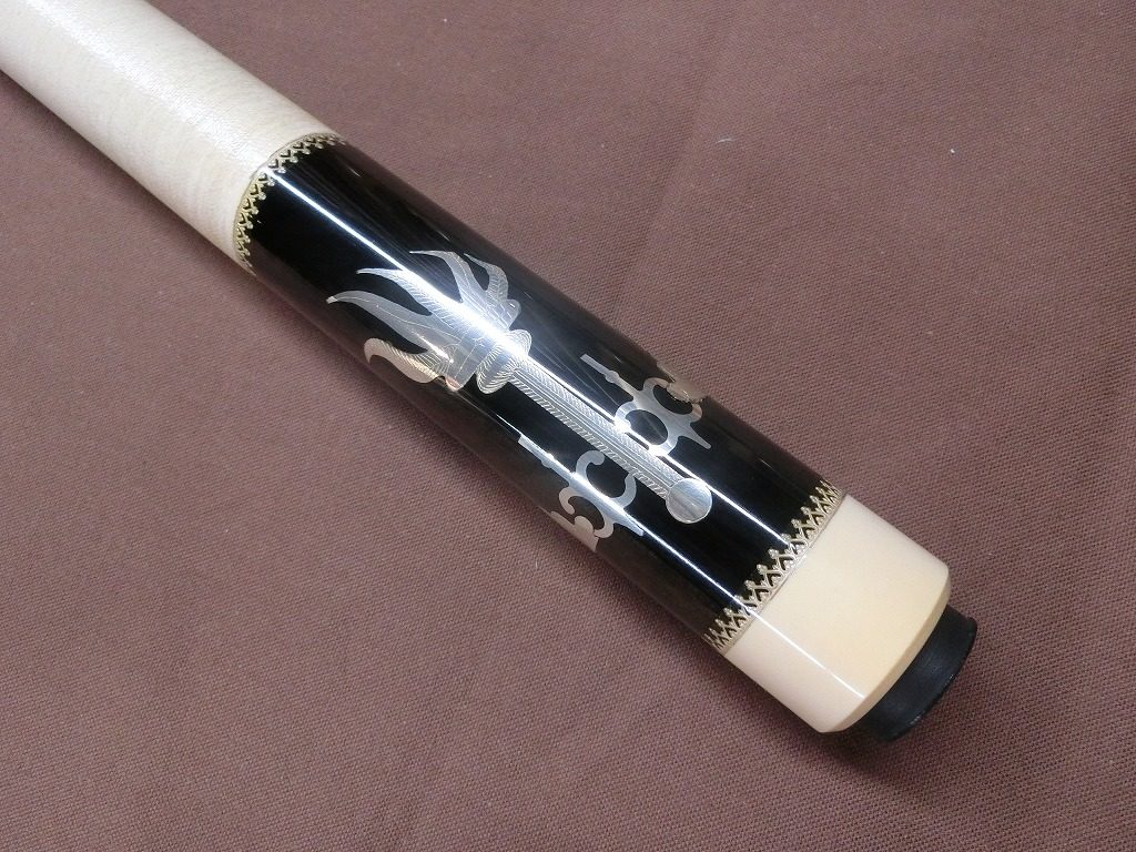 ”C”を背中合わせに2つ繋げた形のインレイはカーセンブロックではよくみられるインレイの1つで「スプライト」と呼ばれています。このキューではそれが多用されています。