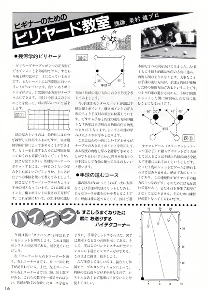 逸崎プロ(当時最年少プロだった!)が全日本選手権のローテーション決勝戦で決めたダブルバンク(2レール・バンクショット)が紹介されています。