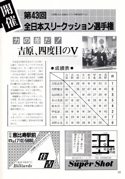 同時開催の全日本スリークッションではベテランの吉原プロが優勝し、現在自由が丘の「ニュー文化」を経営されている甲斐プロが準優勝でした。