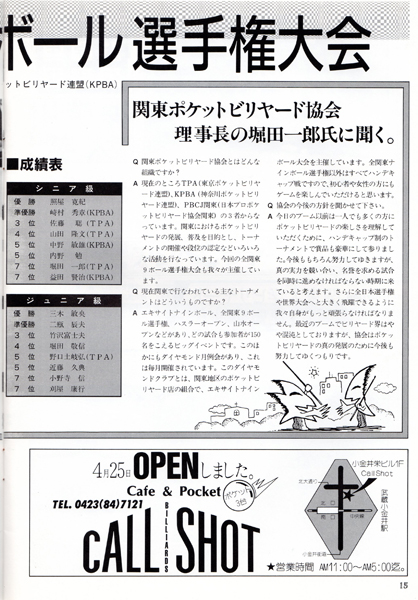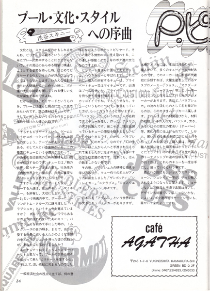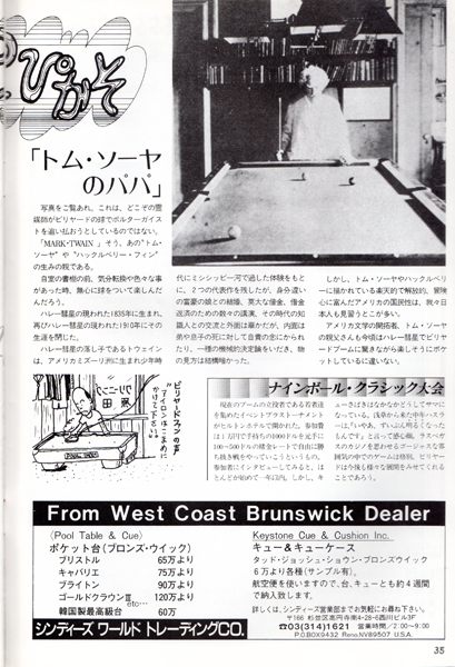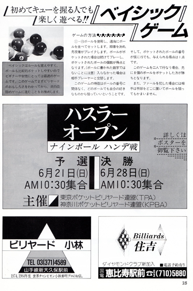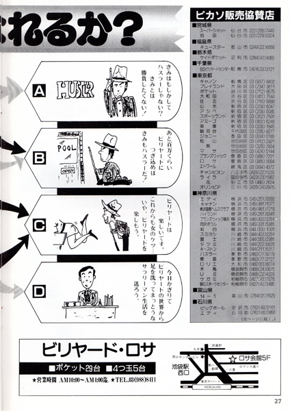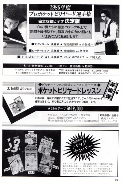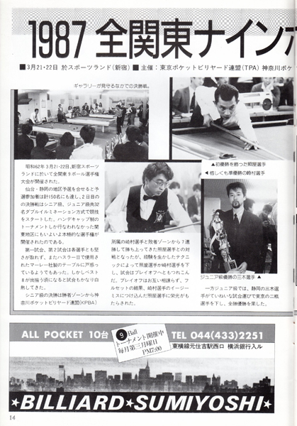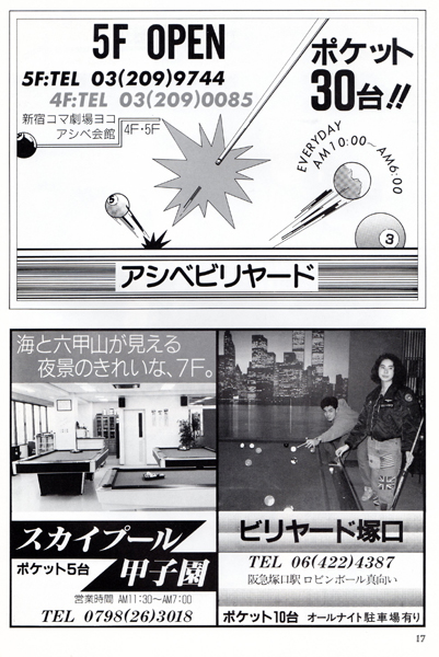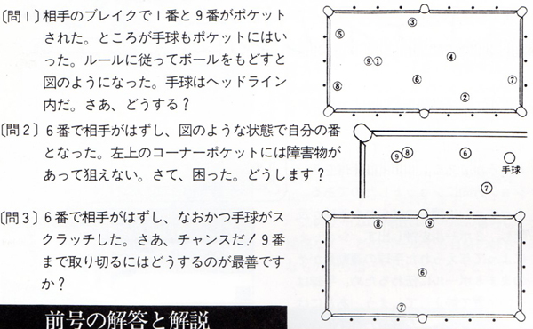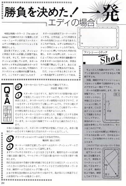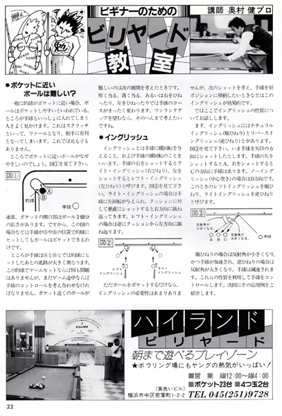 今では常識かもしれませんが、ビリヤードの本といったらほとんどが四つ玉を主としたキャロムの解説本しかないような時代でしたから、このような情報の提供は大変ありがたいものでした。