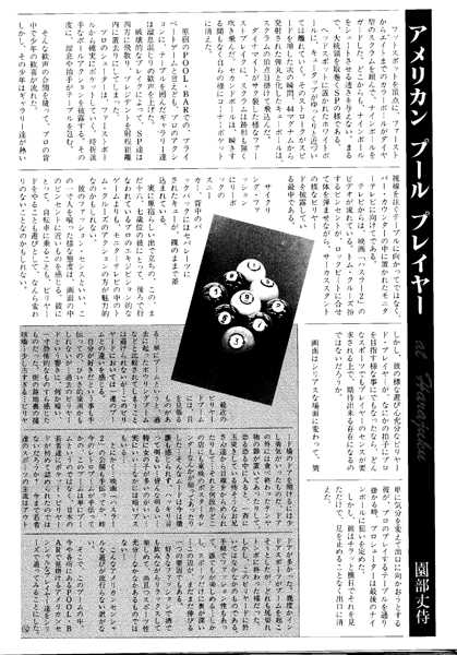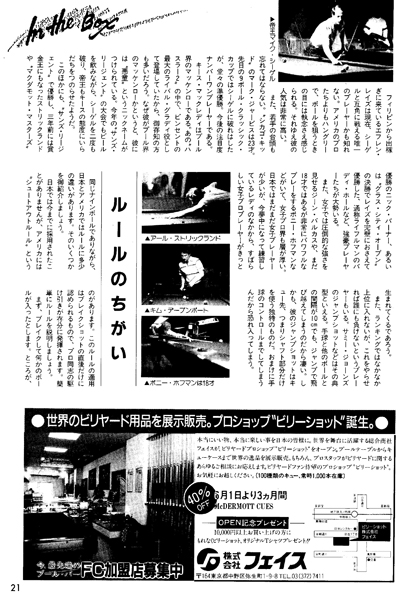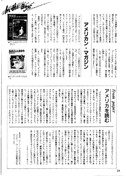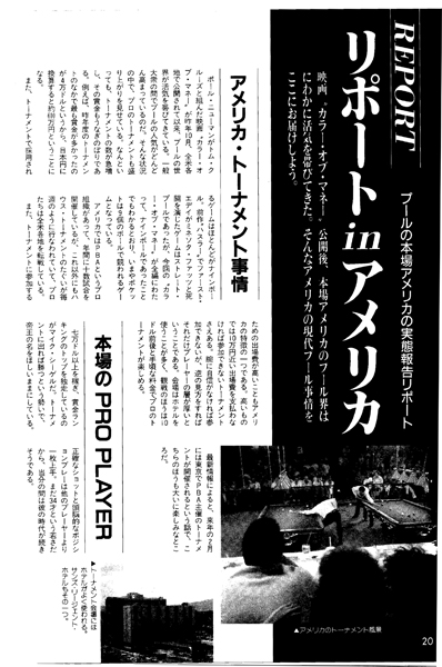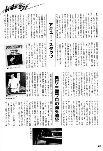 PBA(アメリカプロビリヤード連盟)の活動や優勝賞金が4万ドルだったり、当時まだ34歳だったマイク・シーゲルが年間7万ドルの賞金を稼いだなどのお金の話から、キース・マクレディやバディ・ホール、ジーン・バルーカスといった懐かしい名プレーヤーたちについても書かれています。
