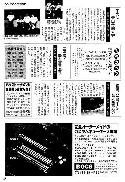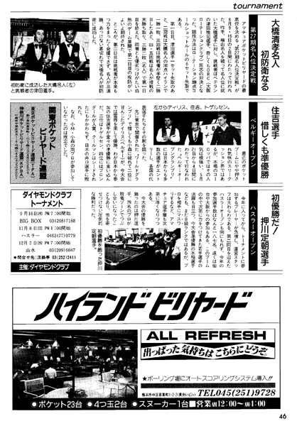 大橋名人(後にプロ転向)の名人位防衛や、スリークッションの住吉プロがベルギーで活躍したことが写真入りで紹介されています。
