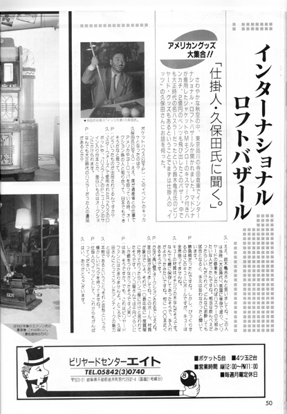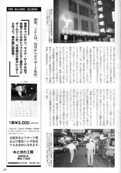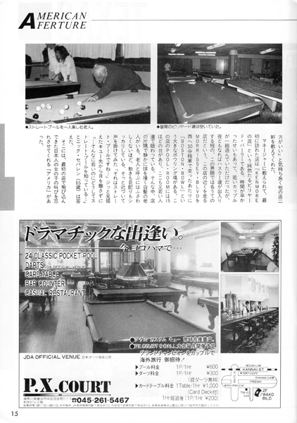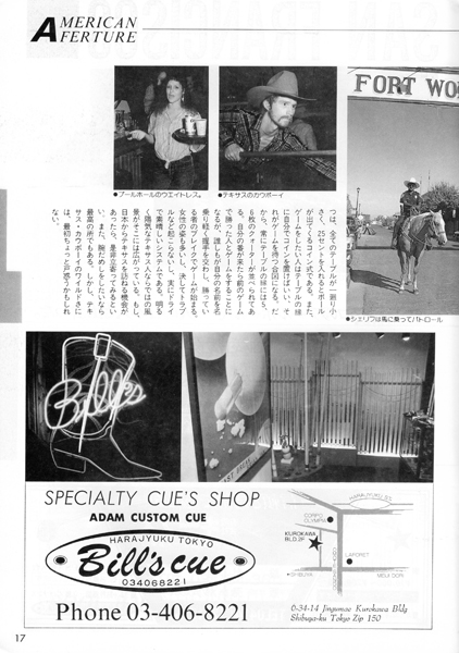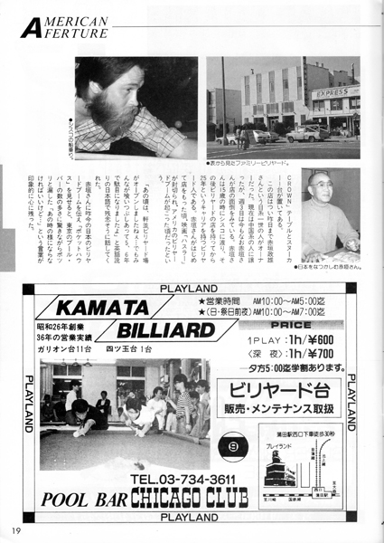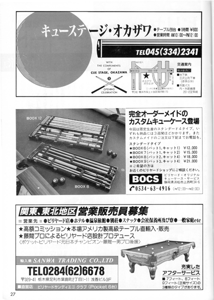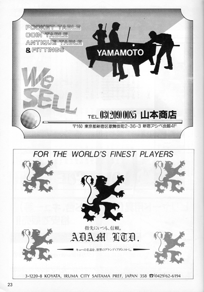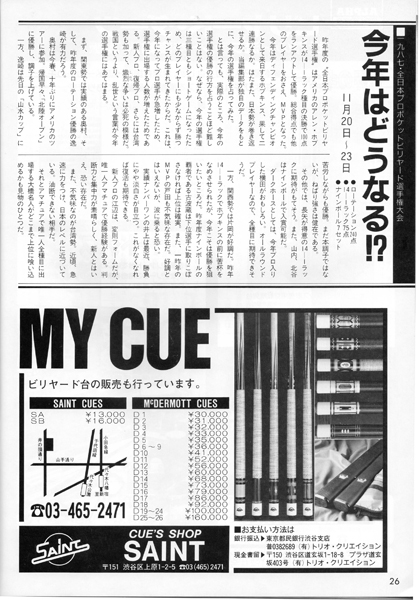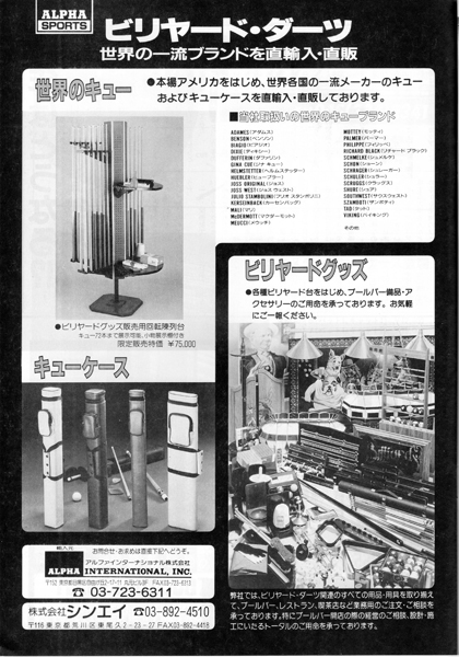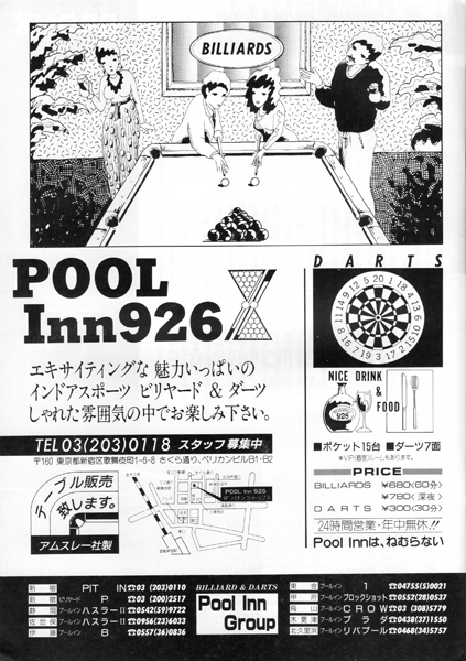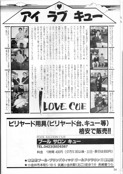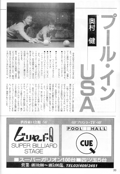 20ページに渋谷のビリヤードQ・POOL HALL CUE の広告がありますね。5階~8階の4フロアに100台もの淡路亭さんのスーパーガリオンを設置していました。